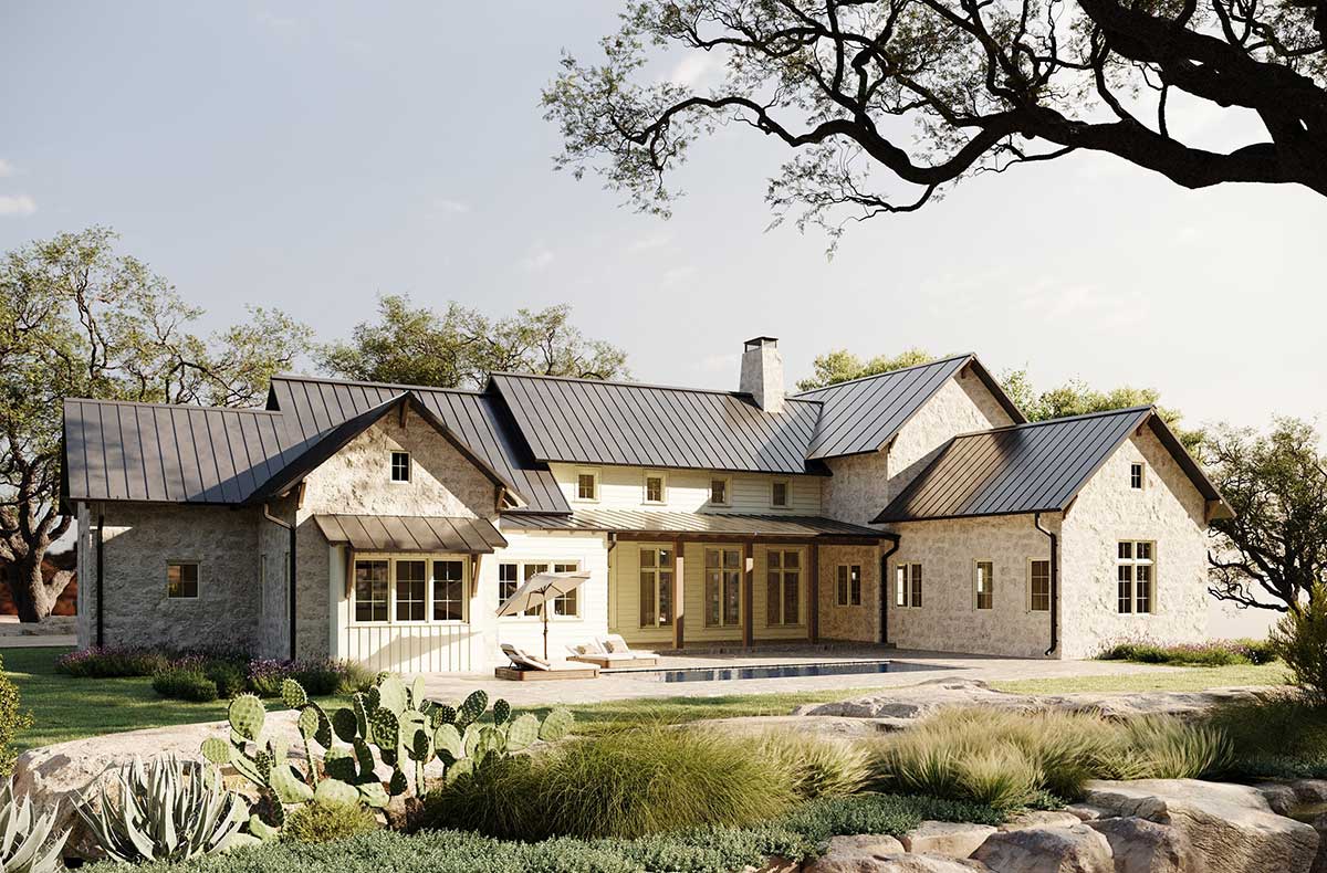 Terraced rear landscaping extends naturally from the back courtyard, while a full wall of windows connects the living spaces to expansive Hill Country vistas, delivering privacy without sacrificing panorama.