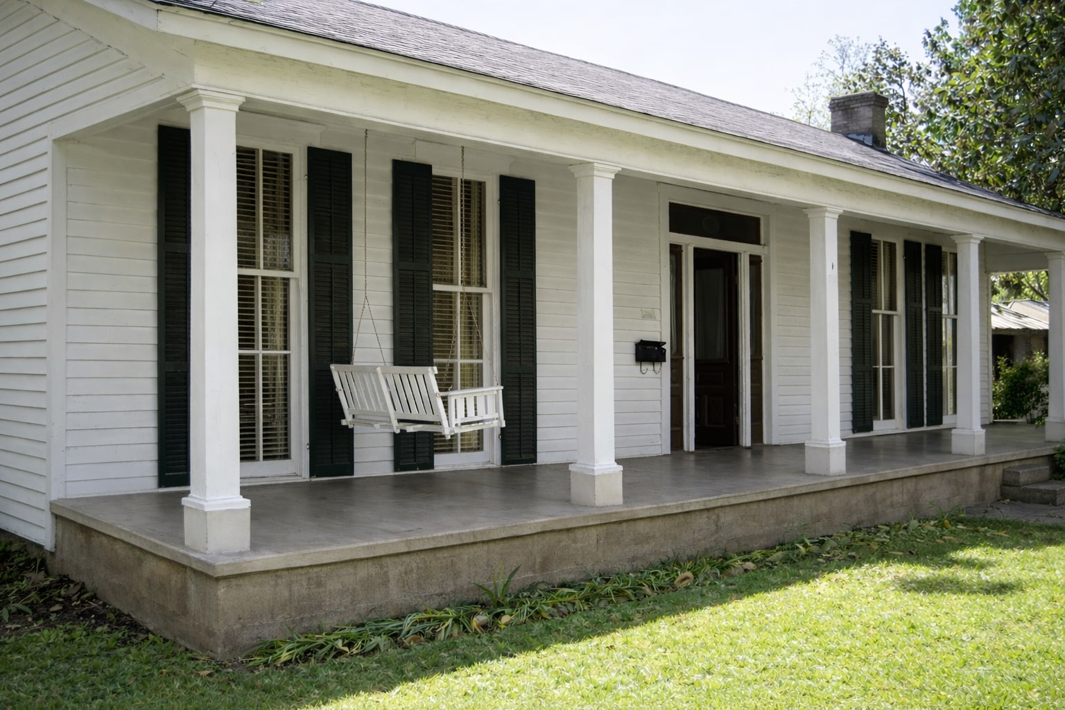 The traditional layout of these homes was typically single-story or one-and-a-half stories, arranged in simple shapes such as rectangles, L-shapes, or T-shapes. A central axis often served the common living areas, with bedrooms extending from the main spine. Roofs were usually gabled or cross-gabled and clad in standing seam metal, with either board and batten or horizontal wood siding. Hallmark features of a traditional Texas farmhouse include straightforward forms, gabled metal roofs, wooden or stone cladding, and double-hung windows. Generous, full-width porches—often at the front, back, or wrapping around—provided shade and a breezy retreat after a long day’s work. These porches were commonly supported by square wooden posts, without detailing in keeping with the functional simplicity of the design. Building materials were selected based on regional availability: pine or cedar in the Eastern, Southern, and coastal prairie regions; and limestone or fieldstone in the Texas Hill Country. Exteriors were typically painted in crisp or creamy whites, while window sashes and trim might feature contrasting darker tones—such as Jasper green—for visual depth. Other accent colors for trim often included muted greens, blues, reds, and grays. Interior palettes favored soft whites, blue-grays, subtle blues, and earth tones, reinforcing the calm, rustic aesthetic.
